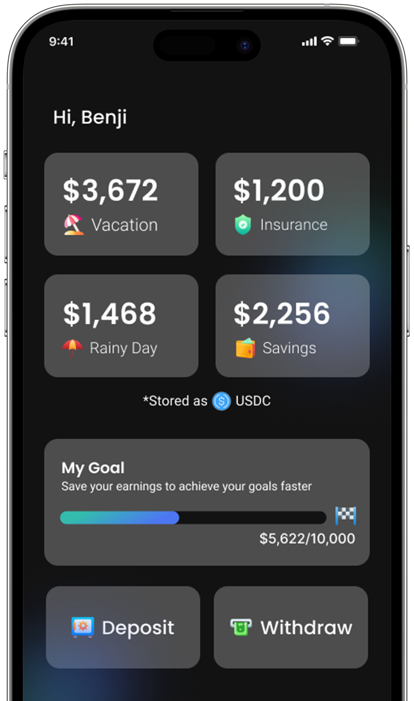 We provide the ability to set aside funds in a non-custodial digital wallet as stablecoins, offering the security and stability of traditional employee benefits (e.g Leave, Rainy Day, Insurance) adapted for the gig economy.
